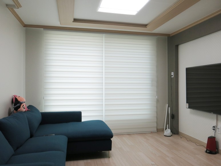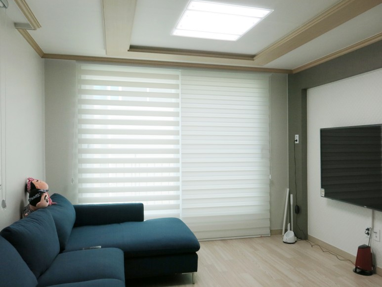 티비와 마주보는 창으로 제품을 시공해서 티비시청에도 방해가 되지 않게끔 하였습니다.