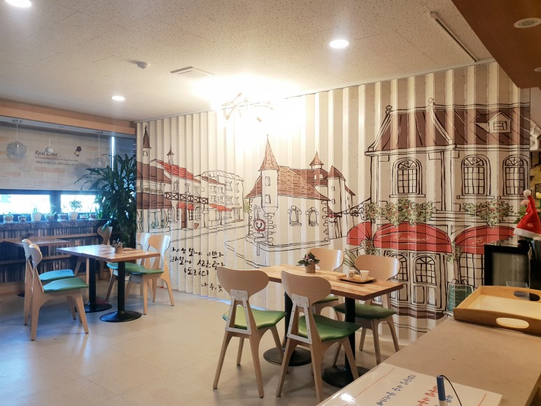 카페공간 분리 목적으로 설치된 실사홀딩도어(자바라)입니다.