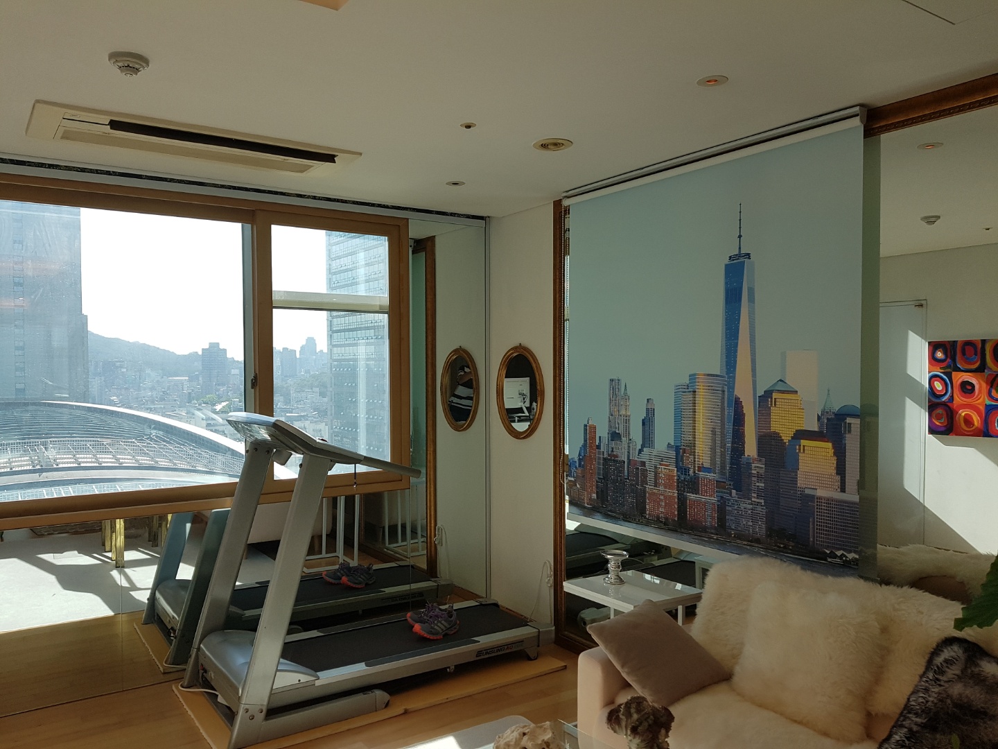 거실의 경우 빌딩으로 빼곡한 이미지로 실사 롤스크린을 제작하였습니다.