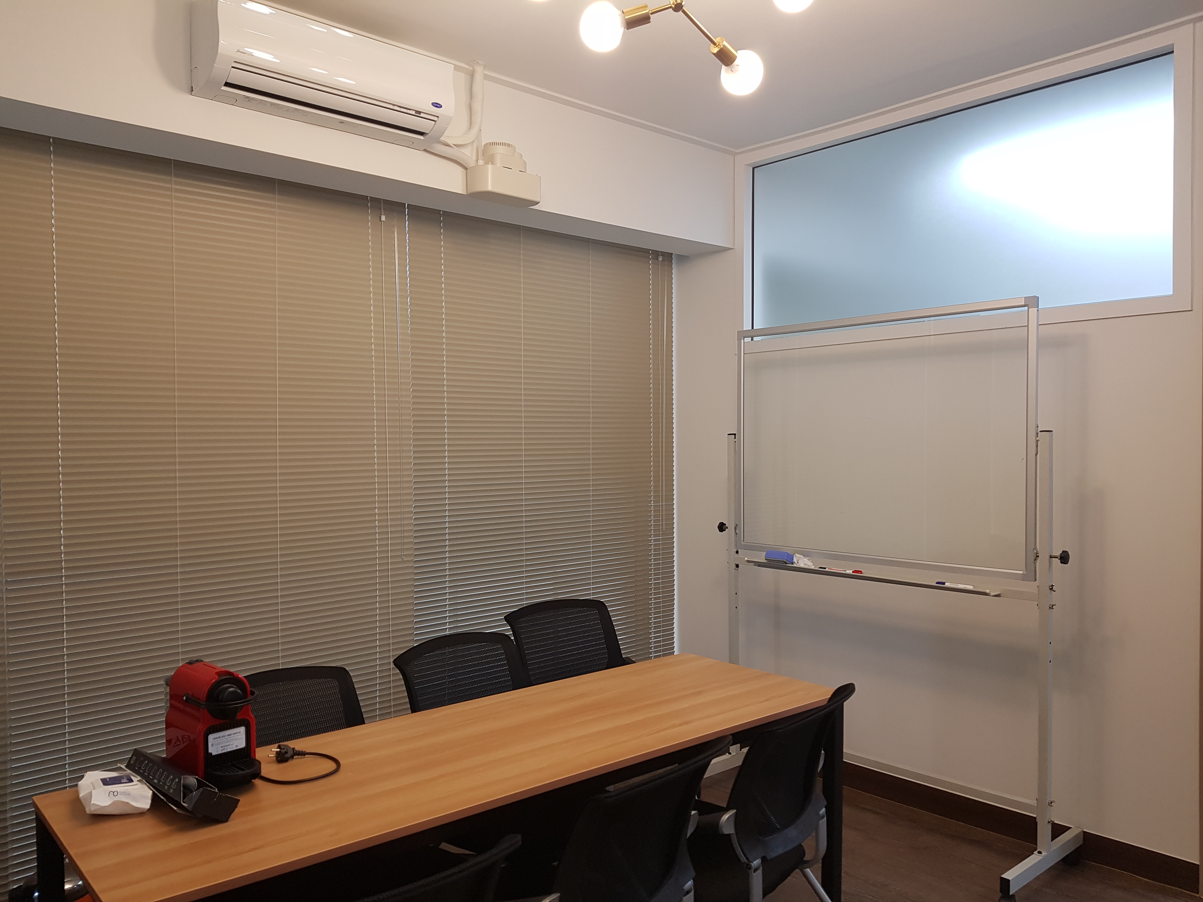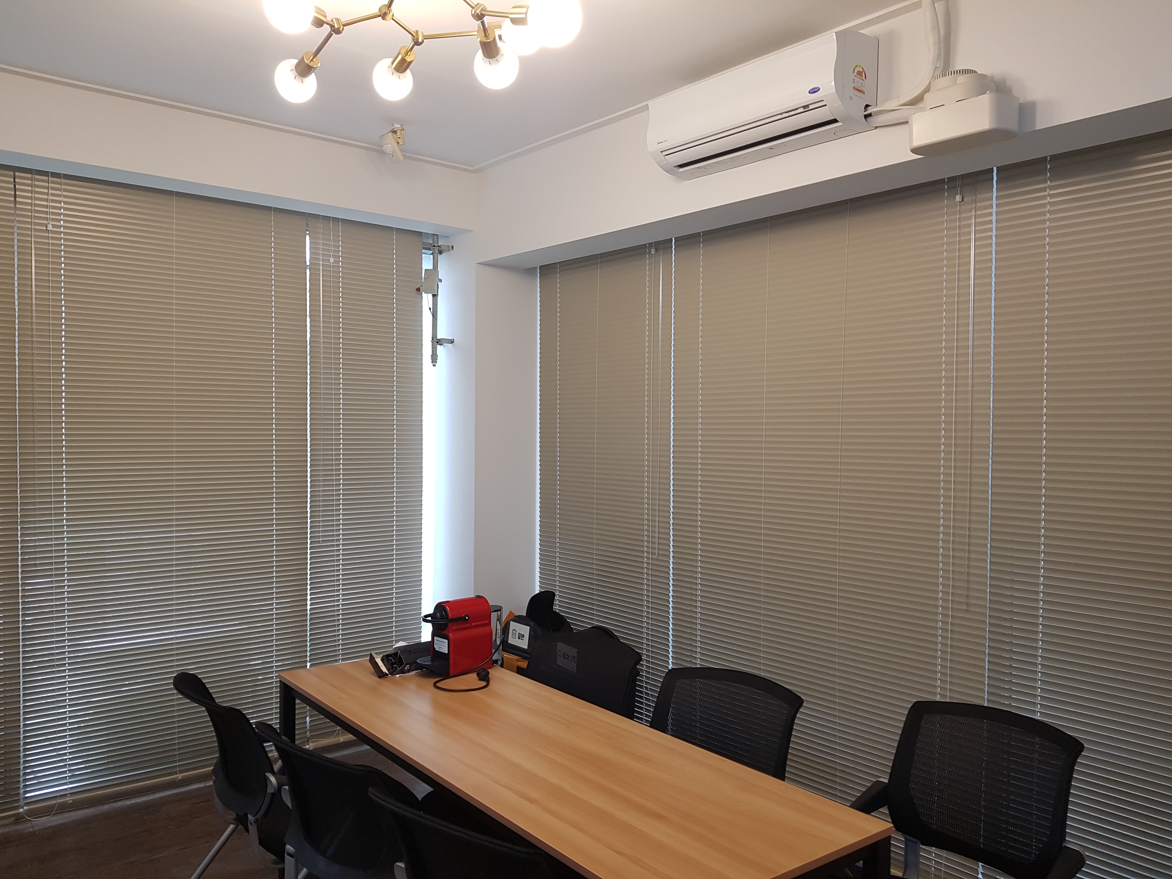 회의실 공간에 알루미늄블라인드 B-104번 컬러를 설치한 모습입니다.