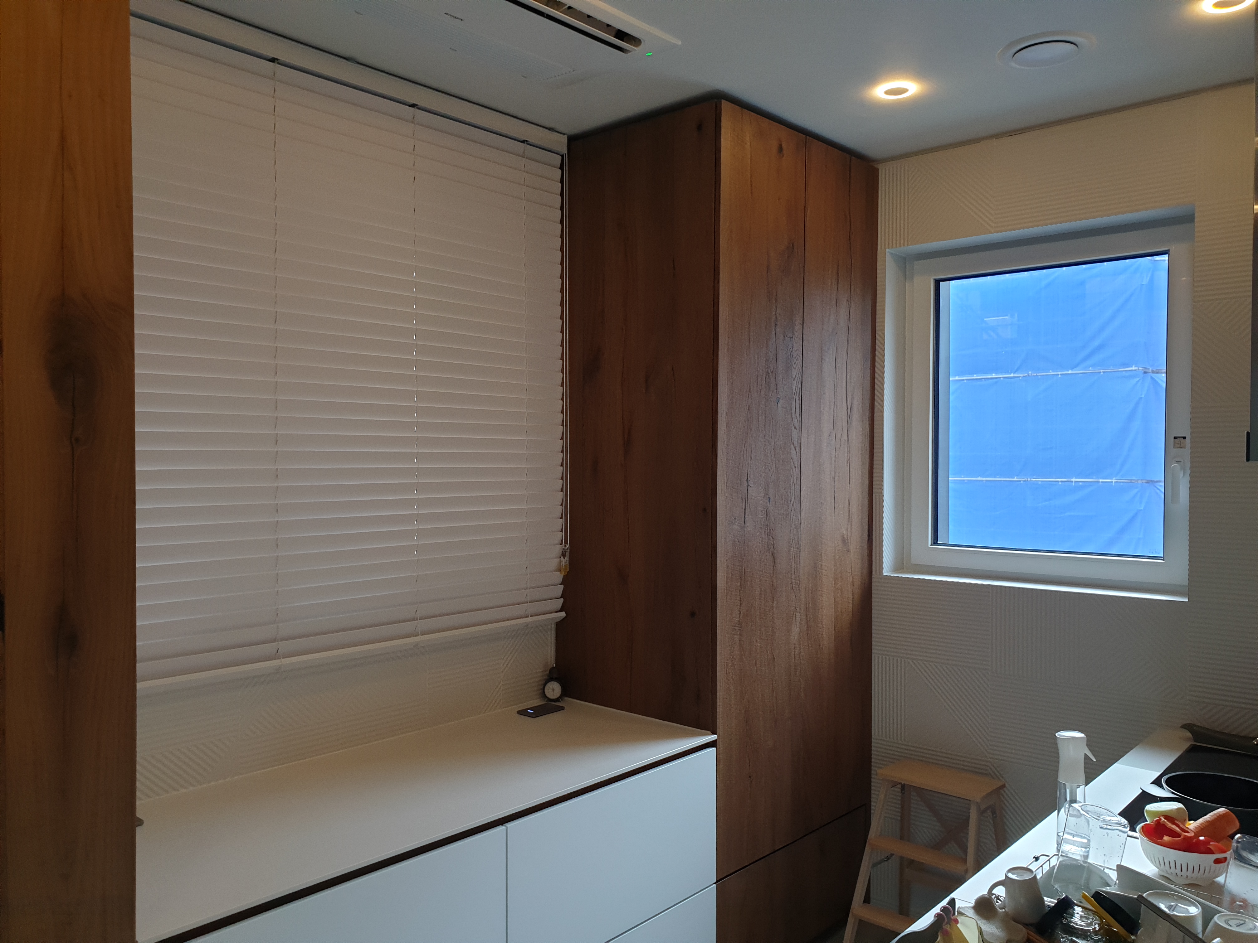 주방쪽창에 우드블라인드를 시공한 모습입니다.
