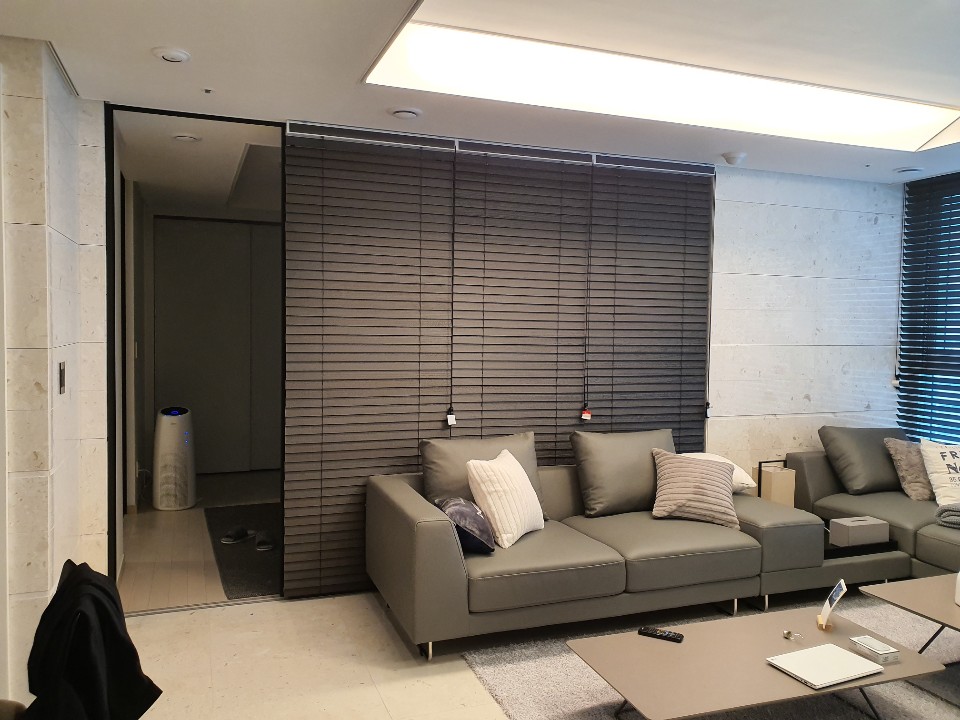 거실에 우드블라인드를 설치해둔 모습입니다.