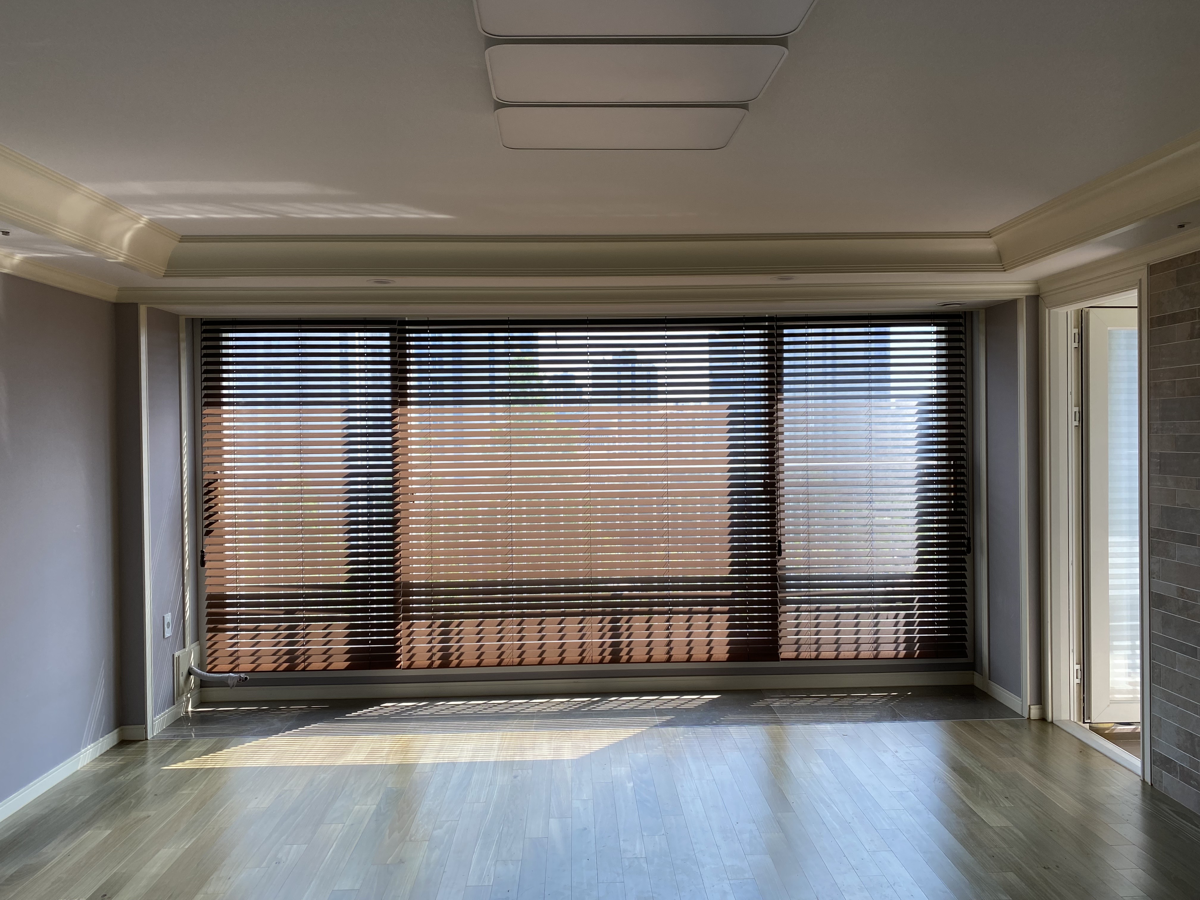 안녕하세요. 블라인드나라입니다. 오늘은 용인시 기흥구에 위치한 가정집에 다녀왔습니다~ 집안 전체적으로 블라인드를 새로 맞춘다고 하여 사이즈 실측 차 먼저 방문드렸습니다. 사이즈 실측을 마친 후 사전에 우드블라인드 제품을 보신다고 하여 샘플을 맞춰서 가지고 갔습니다. 우드 샘플을 몇 가지 보시더니 "오동나무-월넛(5060)"제품으로 선택해주셨습니다. 우드블라인드는 다양한 소재가 있지만 오동나무 소재가 가장 가볍기도 하고 잘 나가는 제품 중 하나입니다. 먼저 거실에 설치한 현장 사진을 보여드리면서 제품 소개를 이어나가겠습니다. 거실에 우드블라인드 월넛 색상을 설치한 모습입니다. 거실이 굉장히 넓어서 우드블라인드로 좋은 인테리어 효과를 낼 수 있습니다~ 거실의 경우는 블라인드를 대부분 세 개로 분할하여 제작합..