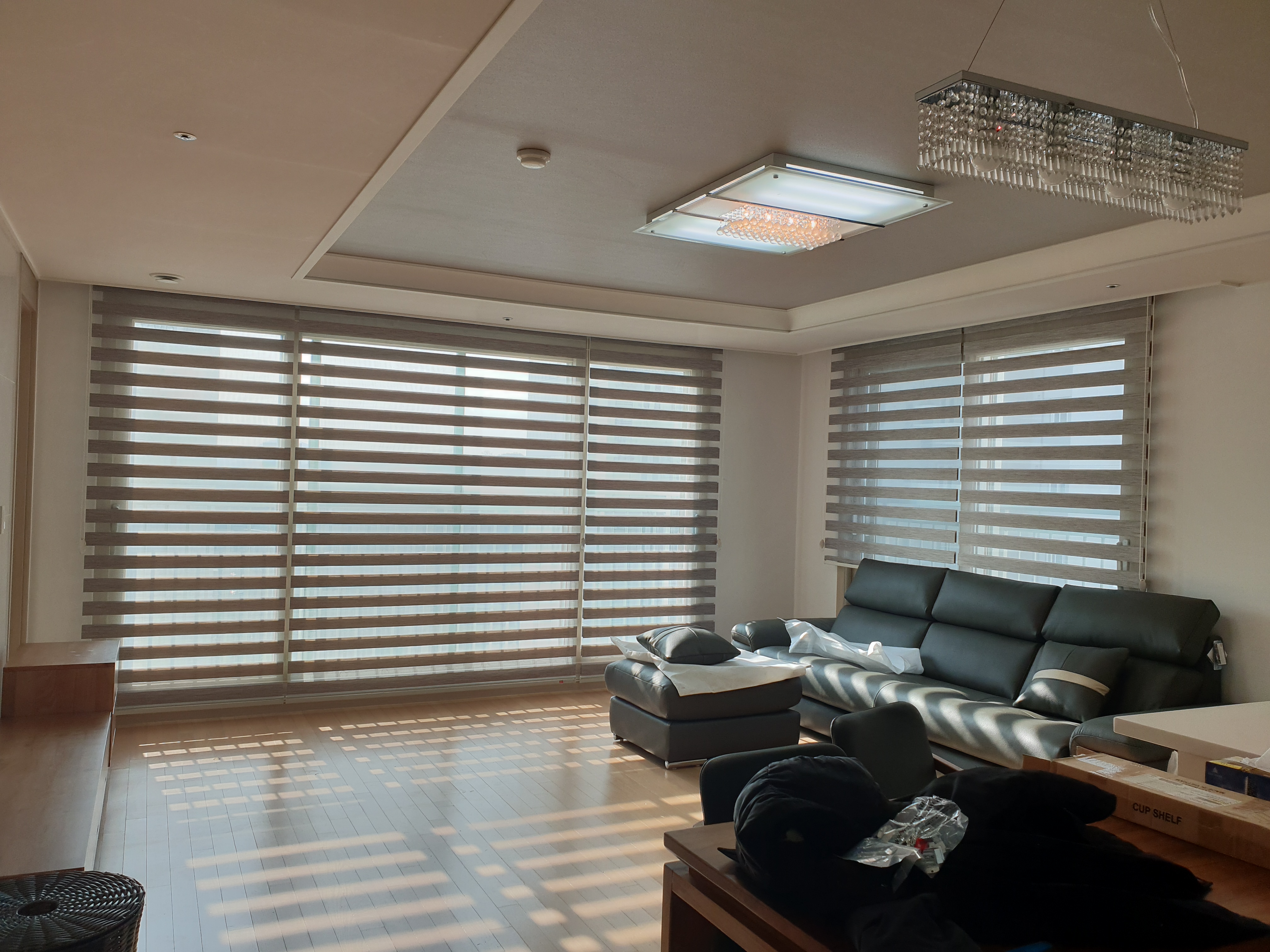 안녕하세요. 블라인드나라입니다. 오늘은 콤비롤스크린 제품을 시공했습니다. 집안 전체적으로 블라인드 교체가 필요하다고 하셔서 방이랑 거실 쪽 블라인드를 교체했습니다. 기존의 제품은 철거 후 새로운 콤비롤스크린으로 시공을 했습니다. 우선 방에 시공한 콤비롤스크린부터 소개를 해드리도록 하겠습니다. 콤비롤스크린의 원단 종류가 여러 가지인데 이쪽 방은 "맨디-초코 색상"으로 선택해주셨습니다. 맨디 제품은 원단에 나뭇결무늬처럼 표현되어있는 제품입니다. 색상은 초코 색상으로 진한 브라운 색상입니다. 2창으로 분할하여 제작 후 시공에 들어갔습니다. 콤비롤스크린은 망사와 원단이 이중으로 되어있는 형태의 블라인드입니다. 요즘 많이 설치하는 제품으로 어딜 가나 한 번쯤은 확인할 수 있는 제품입니다. 망사와 원단의 위치를 조..